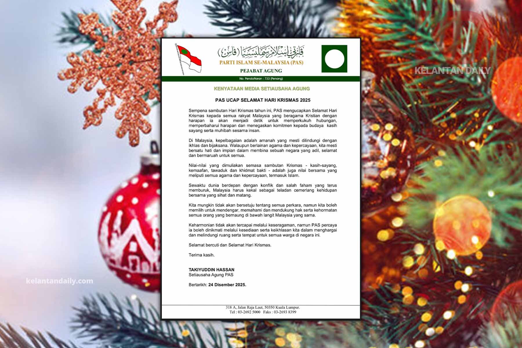 Kenyataan berkenaan ditandatangani oleh Takiyuddin Hassan, Setiausaha Agung PAS, bertarikh 24 Disember 2025.