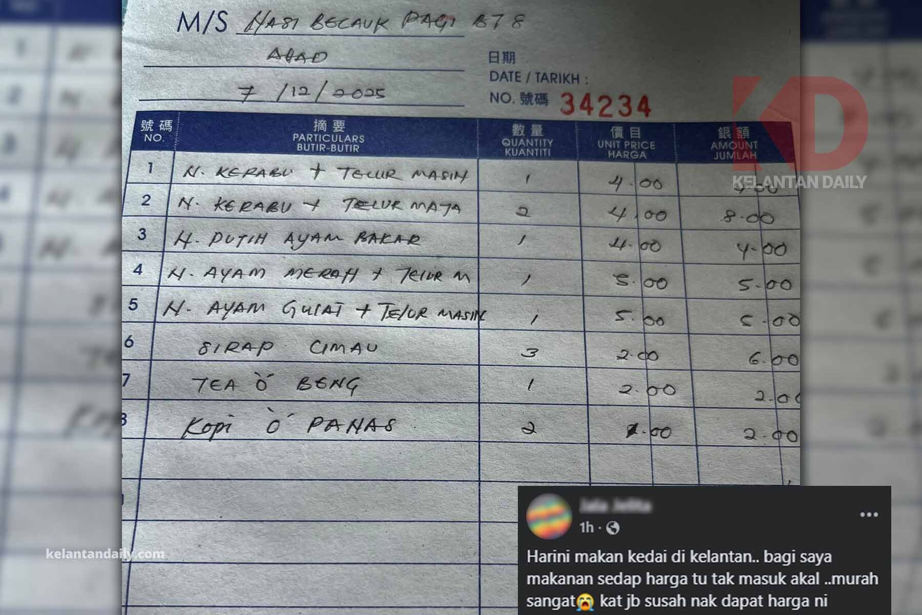 “Harini makan kedai di Kelantan.. bagi saya makanan sedap harga tu tak masuk akal.. murah sangat 😭 kat JB susah nak dapat harga ni sekarang atau mmg kat Kelantan rate harga makanan mcmni?”