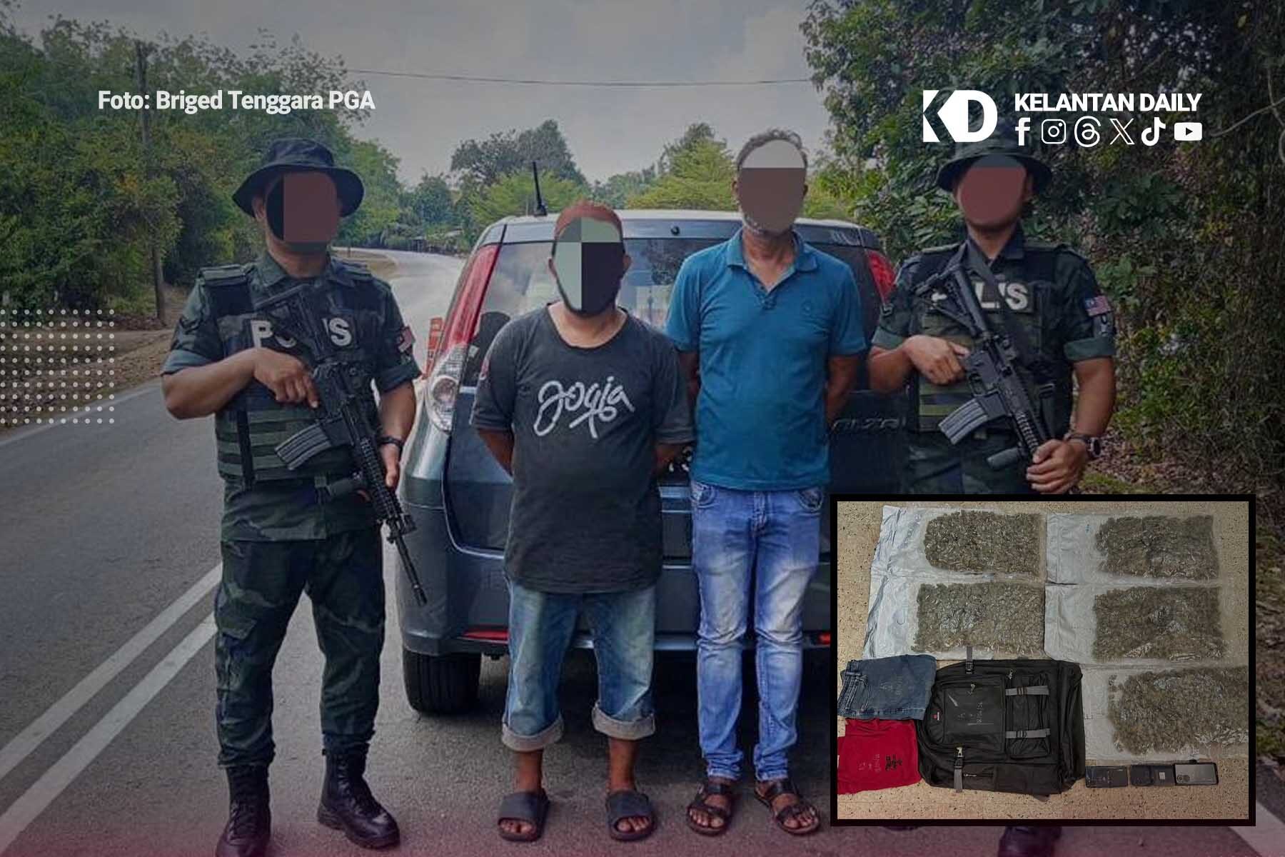 Pasukan Strike Force/Tiger Platoon Kompeni A Batalion 9 Pasukan Gerakan Am (PGA) Kuala Terengganu berjaya menahan dua lelaki serta merampas dadah jenis bunga ganja dalam Op Taring Wawasan Kelantan di Sekat Pintas Pos Serongga, Rantau Panjang.